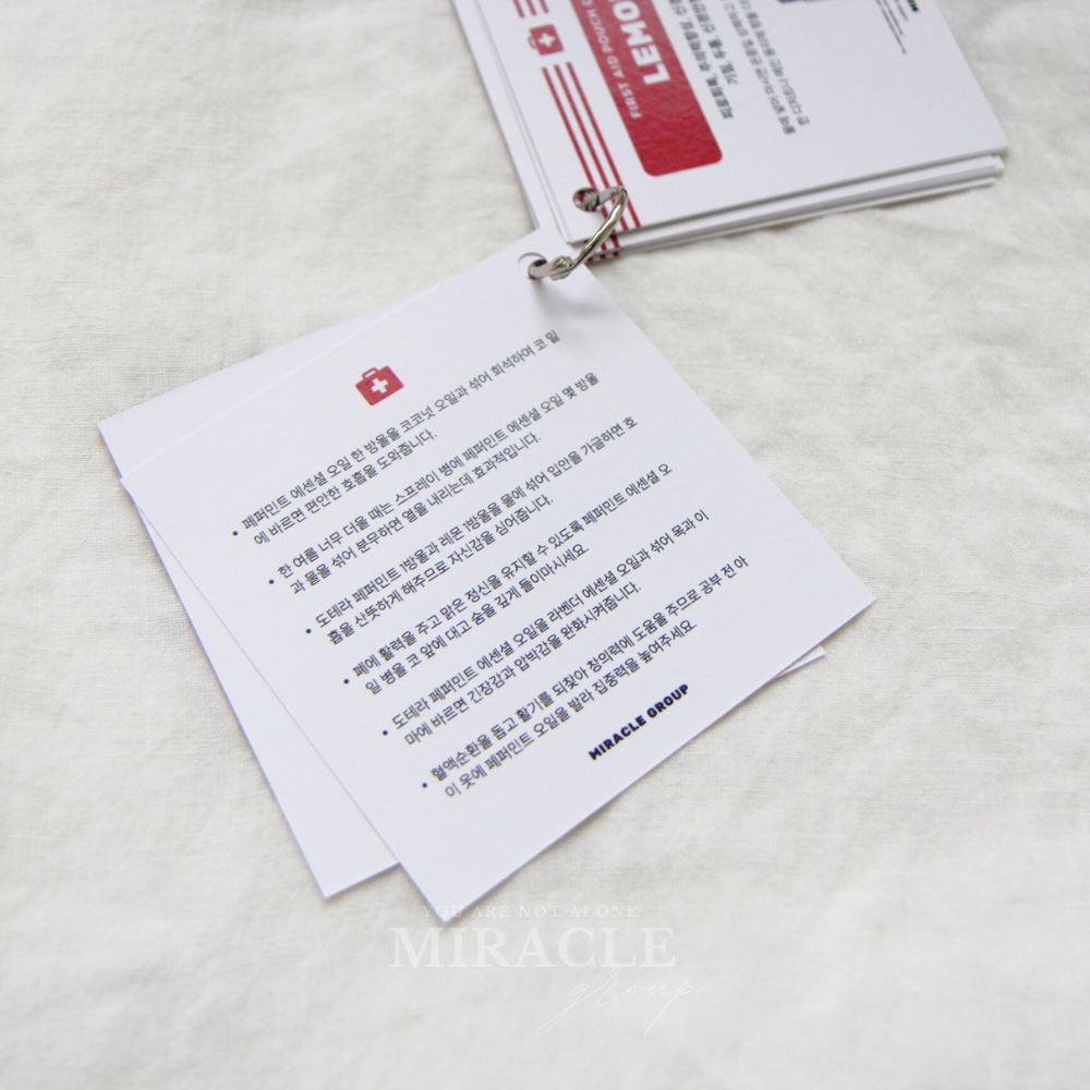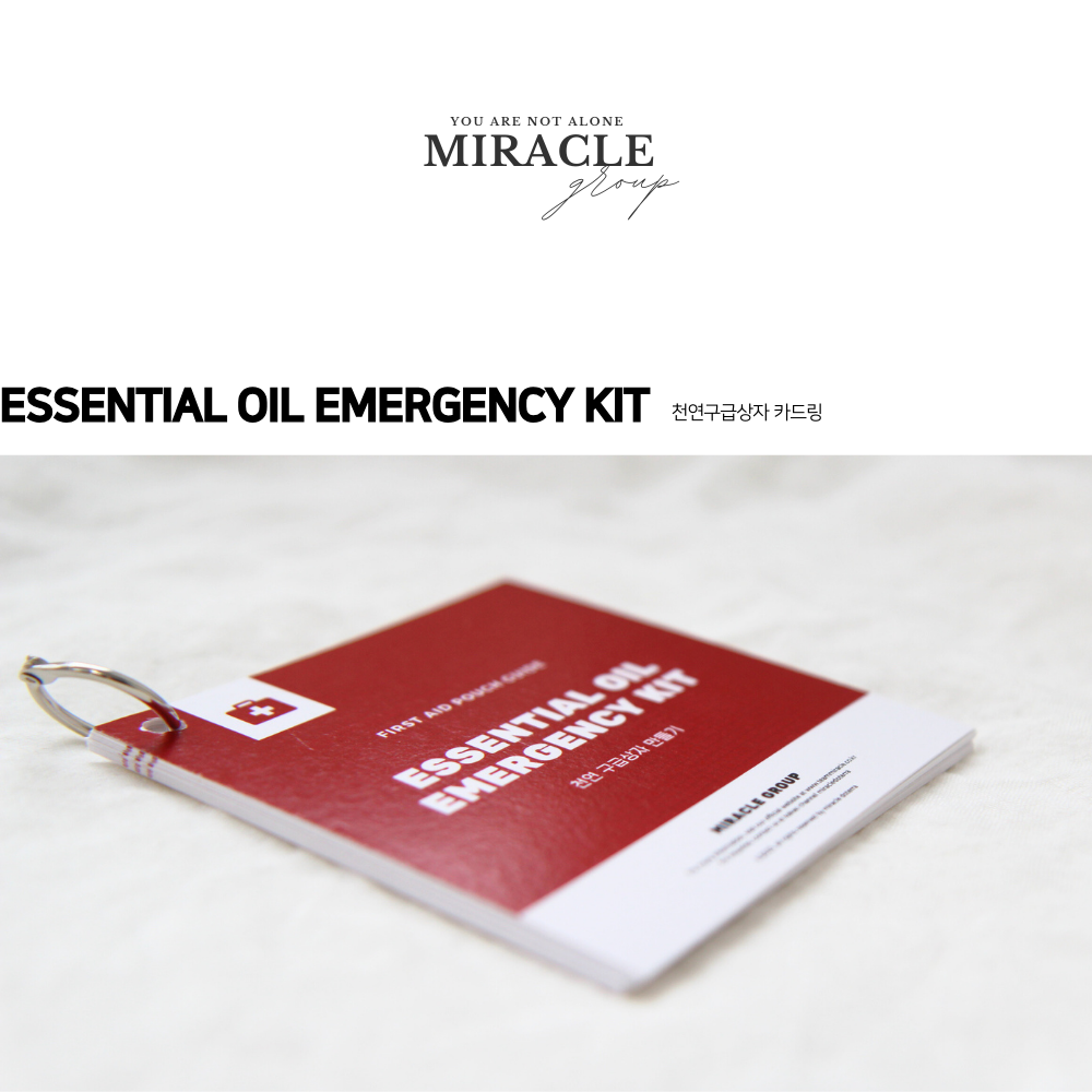 미라클 천연 구급상자 카드링은 [페퍼민트, 레몬, 프랑킨센스, 이지에어, 티트리, 라벤더, 오레가노, 온가드, 다이제스트젠, 딥블루] 등 미라클의 천연 구급 오일을 효과적으로 활용할 수 있는 방법을 담고 있습니다.