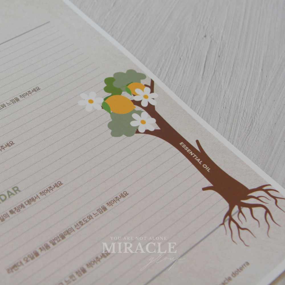 각 오일의 특성과 함께 처음 향을 맡았을 때의 선호도와 인상, 오일과 함께하는 명상 중의 느낌, 명상 후의 변화와 통찰 등을 자유롭게 기록할 수 있는 구조로 되어 있어, 단순한 필기를 넘어서 나만의 감각과 경험을 기록하는 향기 노트가 되어줍니다.