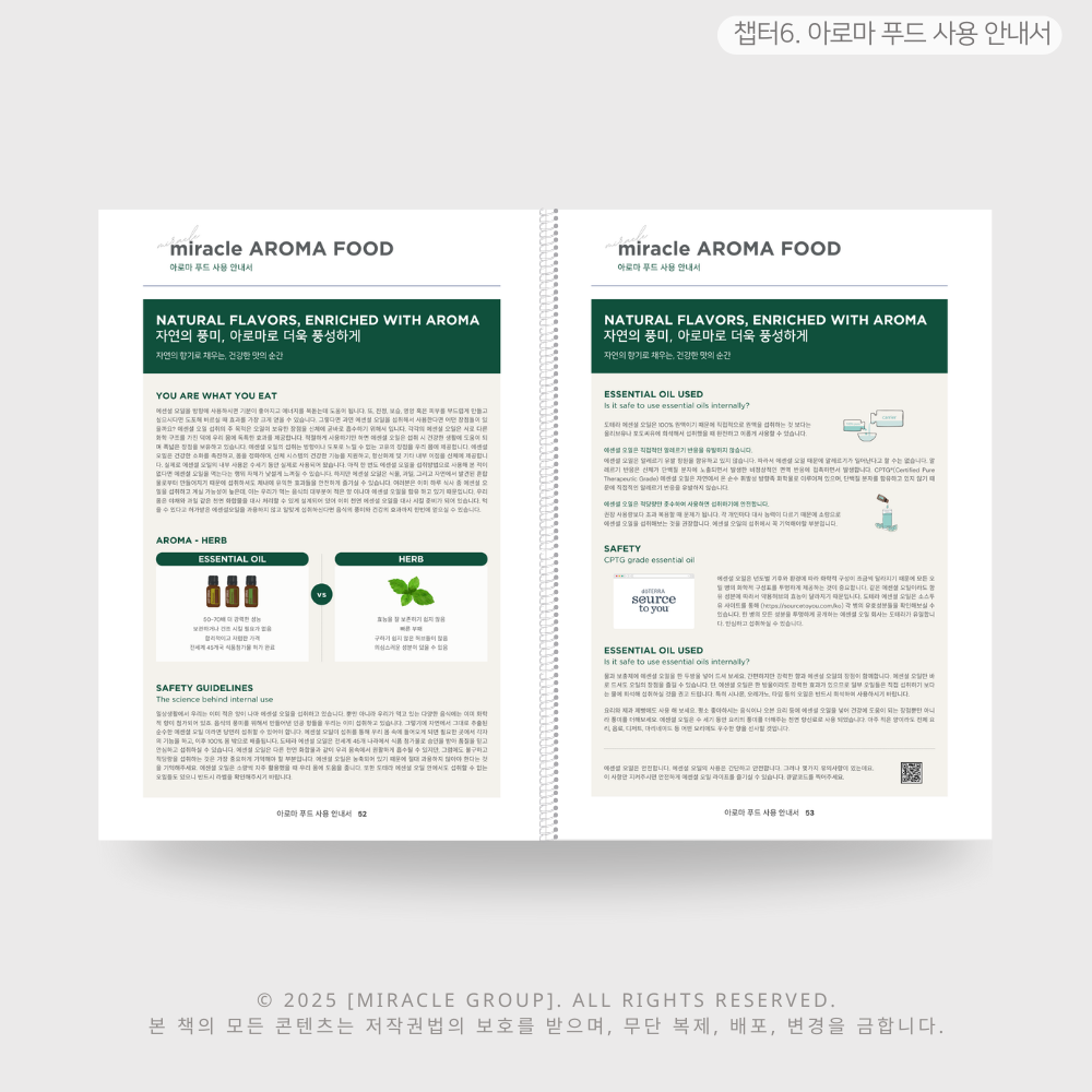 미라클 체험 가이드북은 오일을 통해 직접 체험할 수 있는 다섯 가지 주요 프로그램을 정리한 안내서입니다. 가장 기본이 되는 감정 아로마 사용 안내서부터, 사람마다 다른 퍼스널 향기를 기준으로 구성된 나만의 향기 찾기, 아롬 푸드 사용안내서 까지 !